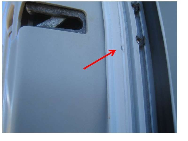 An der Aufbautür ist ein nur minimaler Lackschaden am Rahmen zu sehen, direkt neben dem Sperrriegel, als wenn dort mit einem spitzen Gegenstand eingestochen und kurz gehebelt wurde. Offensichtlich hat der Sperrriegel sofort nachgegeben oder wurde genau getroffen und ist aufgesprungen.