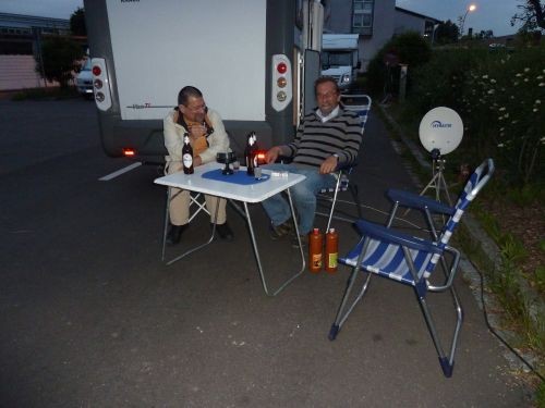 Und den Absacker nahmen wir vorm Womo ![]() Das sieht nach Urlaub aus, weiterhin viel Spaß! was sind denn das für rote Flaschen neben Peter? Lecker Essen und Trinken, das ist ja schon die halbe Miete. Ich bin gespannt, wo es Euch noch hin verschlägt.