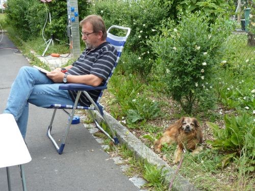 Bruno hat Spaß und nach den Bad rennt er wie ein Irrer. Das hat ihm offensichtlich die letzten Tage gefehlt. Und sowieso ist er viel lebendiger, wenn er mal so richtig nass ist. Vielleicht liegt er deshalb auch so gern im Regen draußen und ist beleidigt, wenn ich ihn reinzerre. Pünktlich gegen 17:00 trübt sichs ein, aber das sind wir ja inzwischen gewöhnt. Fußball fängt eh gleich an....