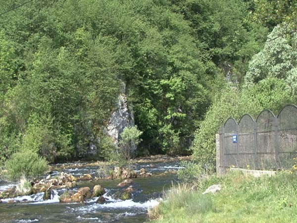 Auf dem Bild sieht man links den grossen Felsen, dahinter soll das "Loch" sein, aus dem der Klokot austritt. Rechts befindet sich das Gebäude in dem das Trinkwasser für Bihac "gesammelt" wird. Daher ist das Betreten des Bachs weiter rauf . um eben um die Ecke, zum Loch, zu schauen, verboten. Daher gibts kein Bild vom Loch :cry: