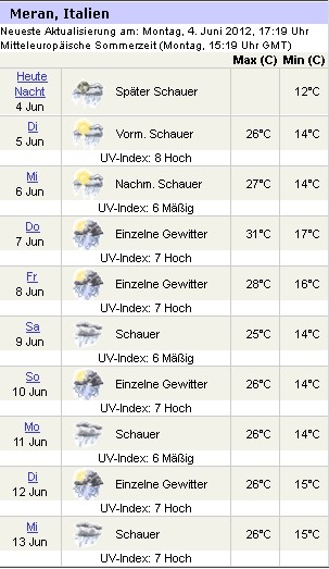 agent_no6 hat geschrieben:Geb doch mal z.B. Meran ein, da ists dann jeden Tag ab Mi locker > 20 Grad und trocken, also das wär mir die paar mehr KM wert...