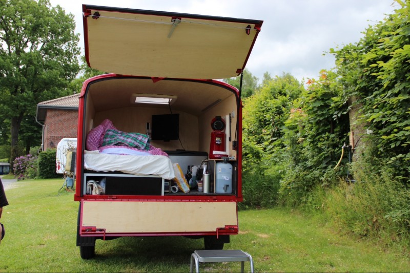 Der Weg nach Dahme war ein einziger Stau. Kurz vor 12 Uhr fuhren wir in Soltau los, und hofften, gegen 15 Uhr dort zu sein. Tatsächlich wurde es fast 18 Uhr. Unterwegs machten wir wegen der Hundis eine Pause auf einem Rastplatz, probierten unser neues Bad aus und Leni fing noch schnell ne Maus. In Dahme angekommen, waren wir ordentlich müde und hatten keine Lust mehr zu kochen. Also gingen wir mit Bea und Carsten im benachbarten Zeltrestaurant lecker essen und ließen den Abend gemütlich ausklingen. Tag 3 Sonntag Die Schafskälte hat uns fest im Griff. Der Wind bläst uns ordentlich um die Ohren und den Kopf frei. Gleich nachdem wir uns zum Frühstück die außerordentlich schmackhaften Quarkmehrkornbrötchen einverleibt haben, radelte ich mit dem Fahrrad ins Städtchen. Die meisten Geschäfte hatten geschlossen, aber zum Glück war der Schlecker auf. Mit etwas schlechtem Gewissen, fand ich dort, was ich suchte ( und noch ein wenig mehr), sprang noch kurz in der Bäckerei vorbei und versorgte uns mit Apfelsoftis und Erdbeerrhabarberkuchen. Anschließend absolvierten wir ein feines Zweistundengängelchen mit den Hundis und gingen abends im "Goldener Anker" frischen Ostseefisch essen. Wir entscheiden uns, entgegen des Plans, bis Dienstag zu bleiben. Tag 4 - Montag Wir sind vom CP zum Leuchtturm gelaufen. Der Weg führte über die Promenade, wo wir an dem Handtaschengeschäft nicht unbeschadet vorbeikamen... Die an der Rezeption ausgehändigten Stadtkarten enthalten keinen Maßstab und so unterschätzten wir den (im zweiten Teil wunderschönen) Weg. Nach mehr als 10 km waren wir mit brennenden Fußsohlen wieder daheim im Bürstel, nicht ohne im Örtchen ein lecker Matjesbrötchen mit garstigen Zwiebeln zu genießen.... Ich weiß, für einen echten Wanderer ist das nix, aber uns tun ganz schön die Gräten weh. Abends gingen wir mit Bea und Karsten nochmal schön essen und ließen dabei unsere gemeinsamen Urlaubstage gemütlich ausklingen. Hier die Bilder vom verrückten Womi..mit freundlicher Erlaubnis des Eigners...