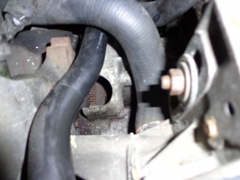Beim Ausbau der Wasserpumpe, ist beim Entfernen des hinteren Wasserschlauches von der Bride die Schraube abgebrochen und - Murpy lässt n - in den Spalt oben auf der Kupplung gefallen (Siehe Bild, Loch zwischen den Schläuchen).