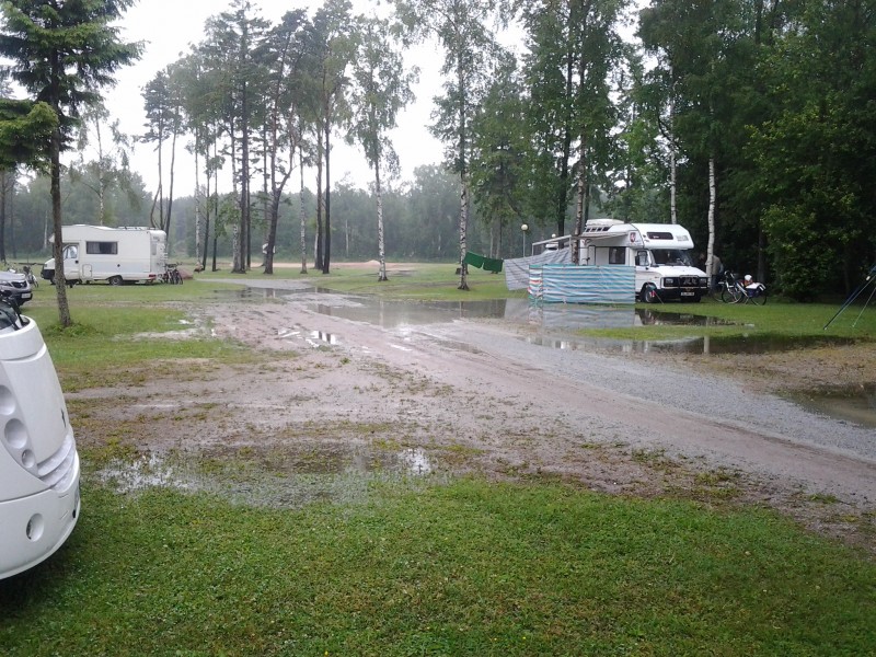 heute Morgen auf der Insel Saaremaa in Estland, die ganze Nacht hat es geregnet, und zwar ordentlich. Ich mag das Plätschergeräusch auf dem Dach, es ist einschläfernd und ich freue mich, dass es drinnen schön warm und trocken ist. Auch jetzt regnet es noch, das werden wir einfach "abwettern", lesen, bloggen, kochen... Aber der CP sieht schon schlimm aus, einzelne Womos mussten mit Trecker herausgezogen werden. Nur die Einheimischen tun mir Leid, es ist doch Mittsommerwochenende...
