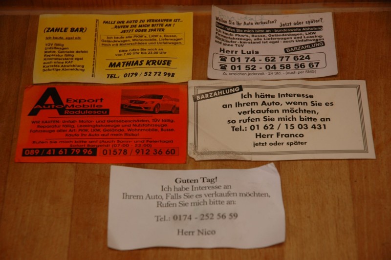ich habe alle paar Wochen eine Visitenkarte von jemand am Auto, der es unbedingt kaufen will, dem die Kilometer egal sind, der es auch mit Unfallschaden usw. kauft. Zuerst habe ich die weggeschmissen, jetzt bewahre ich sie auf. Hier mal meine Sammlung (ohne Dubletten):
