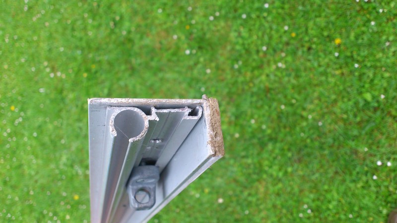 Ein Aluprofil mit Sikaflex etwas oberhalb der Original Regenrinne ans Dach kleben (ich möchte nicht ins Dach bohren). Das Profil soll gleichzeitig einen Keder bieten für eine Primitiv-Markise. Etwa so könnte es aussehen: