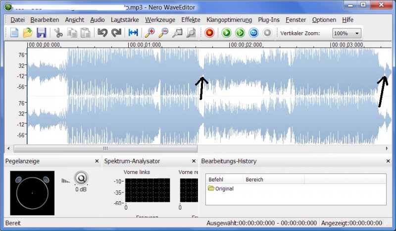 ah, ja, da ist meine letztgenannte Möglichkeit doch zutreffend: nero-Wave-Editor. Schau mal, ob du eine Neroversion hast, auf der dieses Teil integriert ist. Mit dem Teil kürze ich bei Liveaufnahmen den Beifall und sonstige Störungen raus. Geht ganz einfach. Hab zwar noch nie eine so große mp3-Datei damit bearbeitet, aber, wenn du alle restliche Software aus dem Speicher nimmst, also nur Wave-Editor lädtst, müsste es gehen. Sonst habe ich keine Software für solche Fälle. Die Trennung zwischen den Songs könntest du an kleinen Pausen erkennen(?) siehe Foto ![]() Ja, das wäre die Herangehensweise: Riesige MP3-Datei nehmen, mit Ansehen und Hören die Trennstellen finden, auftrennen in lauter Einzel-MP3-Dateien, und die dann wieder als neue MP3-CD brennen.