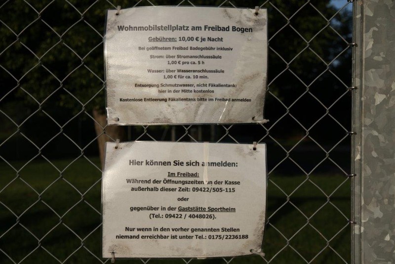 Wir stehen gerade am Stellplatz in Bogen. Bei dem heißen Wetter toll, da bei den 10 EUR pro 24 h der Eintritt ins Freibad ebenfalls enthalten ist. Als wir gestern ankamen als erstes ins Bad (Samstag, Sonntag und Feiertag bis 19 Uhr geöffnet, Montag bis Freitag bis 20 Uhr). Und nachher, wenn es um 9 Uhr öffnet, geht’s gleich nochmals rein, bevor wir abfahren. Die Kassiererin war super nett. Als erstes überreichte sie uns eine Mappe mit Infomaterial zum Ort und Radkarten. Und fürs Abendessen empfahl sie uns das Gasthaus Zur Post (gegenüber der Kirche). Diese Empfehlung können wir nur weitergeben. Ein schöner Biergarten und schmackhafte Bayerische Küche zu sehr moderaten Preisen. Ca. 5 Minuten zu Fuß. Es sind 5 gepflasterte Stellplätze mit dazwischenliegenden Rasenflächenvorhanden. Dass wir auf der Rasenfläche stehen hat den Grund, dass das bei Ankunft die einzige zugängliche Stelle war, die nicht vor den Pfosten von PKWs zugeparkt war. Gegebenenfalls bei der Kasse melden. Dann müssen die PKW-Halter ihre Fahrzeuge umparken. Auf dem Stellplatz gibt es Toiletten außerhalb des Freibades. Die Behindertentoilette ist rund um die Uhr zugänglich. Dort kann auch die Fäkalienbox entleert werden (der Kassiererin Bescheid sagen). Bei den Stellplätzen gibt es einen Bodeneinlass für Grauwasser. Gegen Aufpreis: Stromanschlüsse sind vorhanden, ebenfalls Frischwasser (siehe Foto unten). TIPP: Wer in den Bayerischen Wald möchte und hier einen Zwischenstopp einlegt, kann sich bereits im Tourismus- und Informationszentrum im Bahnhof kundig machen (Mo-Fr 6:30 – 18:00, Sa 8:00-18:00, So 9:00-18:00; Angaben ohne Gewähr :wink: ). Hier gibt es eine Infostelle Naturpark Bayerischer Wald. Da wir bereits auf dem Rückweg sind, waren wir allerdings nicht selbst dort. ![]() ![]() Liebe Barbara Schönes Freibad , aber heuer leider ab 1.9. geschlossen. Unbedingt den Bogenberg mit der Wallfahrtskirche besichtigen. |