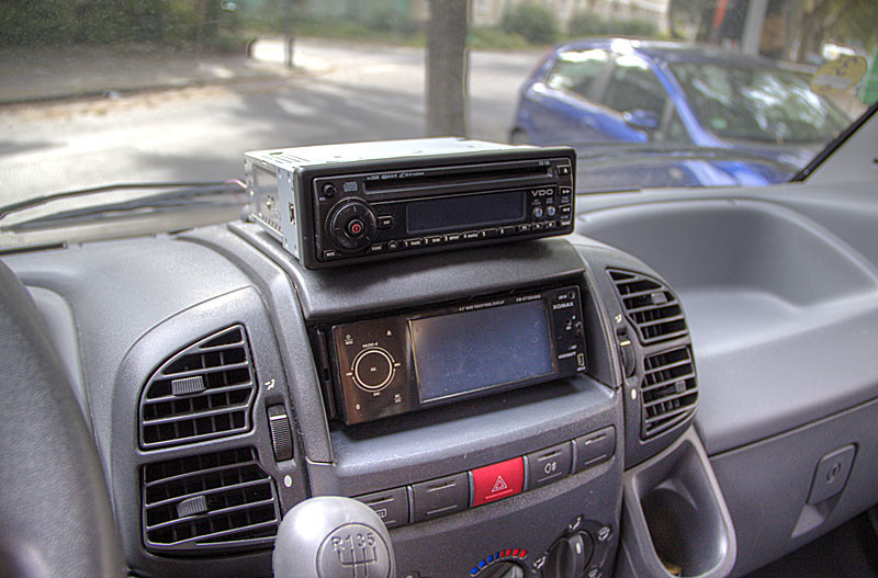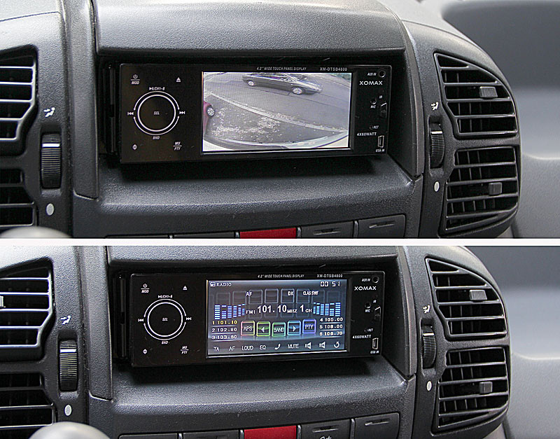 3.) Der Monitor Irgendwie kann ich mich nicht damit anfreunden, das ein 7"-Monitor das ganze Jahr im Sichtbereich rumhängt, wenn er nur ein paar Mal benötigt wird ;-) Also wäre ein Monitor im Radio schick, auch bekannt als "Navi-ceiver", die es meist als Doppel-DIN gibt. Leider hat der Ducato-244 nur ein Einfach-DIN-Schacht, und den auch noch leicht nach hinten versetzt. Ein ausklappbarer 7"-Monitor in einem Einfach-DIN-Radio könnte deshalb oberhalb vom Radioschacht anecken, ausserdem dauert ja das Herausfahren, solange muß man dann mit dem Rückwärtsfahren warten. Bleibt noch die Möglichkeit eines festen Monitors im normalen Autoradio, der nicht über die Gehäusefront hinausragen darf. Fündig wurde ich mit einem 4,2"-Monitor in einem XOMAX-DTSB4800, den ich durch das Serien-Radio von VDO getauscht habe.