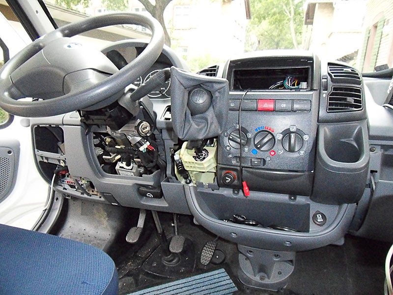 Die Touch-Screen-Bedienung ist gewöhnungsbedürftig, das Empfangsteil in Verbindung mit der schlechten Fiat-Antenne eher Durchschnitt, aber während der Fahrt brauchen wir eh kein Radio, wir unterhalten uns selbst ;-) 4.) Die Verkabelung Jetzt kommt der "schwierigere" Teil. Zum einen muß ein Video und ein Steuerkabel vom Sicherungskasten zum Radioschacht kommen, zum anderen brauche ich ein "Zündungsplus", damit die Heizung in der Cam und die Wetterschutzklappe ohne Steuersignal arbeiten kann, aber im Stand nicht die Batterie leer saugt. Da ich nicht weiß, wie und wo genau man Kabel diagonal hinterm Armaturenbrett verlegen kann, habe ich einfach mal ein paar Verkleidungen abgeschraubt, was schon n bissl chaotisch ausgesehen hat....