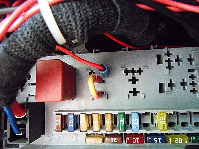 ...aber ich habe Wege gefunden... Nun fehlt noch Zündungsplus, aber woher nehmen und nicht stehlen, bzw. anzapfen? Das habe ich mir dann, auf eine zugegeben etwas "unorthodoxe" Art und Weise, besorgt: In diesem Thread --> Link habe ich bebildert, wie man die 12-Volt-Steckdose im Fahrerhaus auf Dauerplus umrüstet, in dem man das Schaltrelais herauszieht und durch eine Drahtbrücke ersetzt. Da bleiben aber noch die Kontakte übrig, um das Relais mit der Zündung zu schalten. Also habe ich mir an den Relaiskontakten oben rechts mit einem Steckverbinder die 12 Volt abgegriffen, die normalerweise das Relais für die 12V-Steckdose schalten würden: