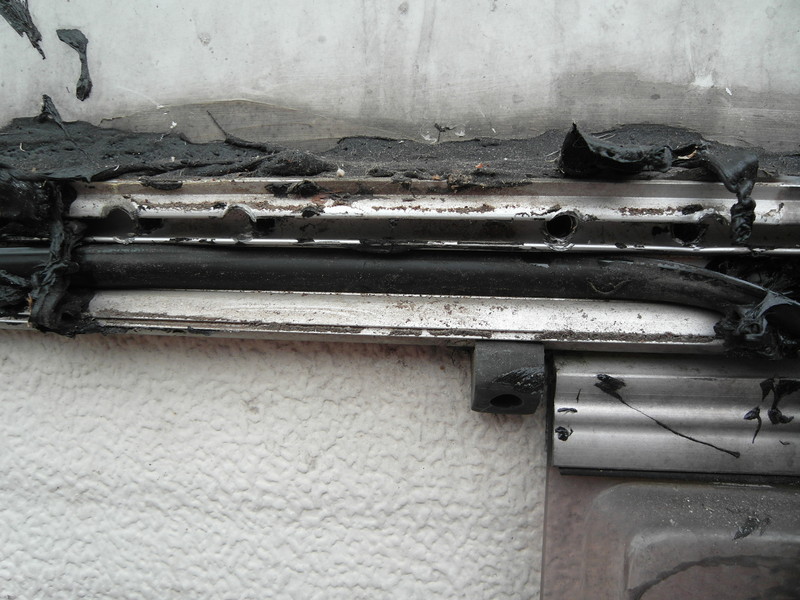 Außerdem sind die Bohrlöcher genau in die untere Kante der Kederschiene gebohrt ! Irre wie man sowas nur machen kann. Zu 100 % kommt dazu, dass dies einfach nur durchgebohrt und unter die Schraubenköpfe Dekalin kam. D.h., zwischen Metall und Leistenfüller und unter dem Leistenfüller ist kein Dichtmittel.