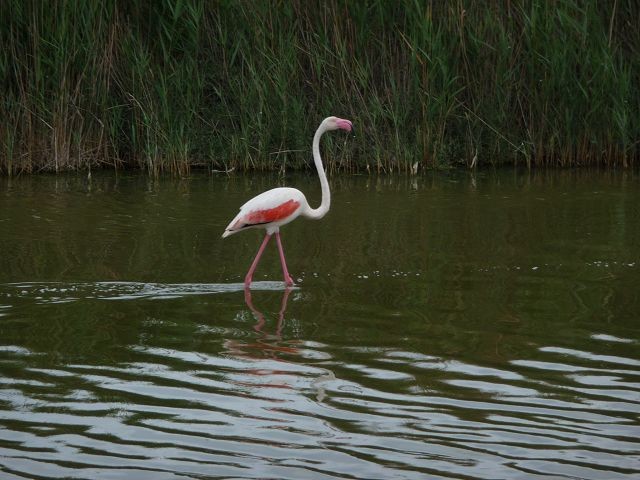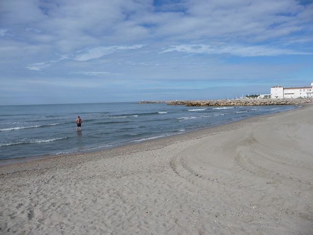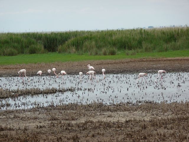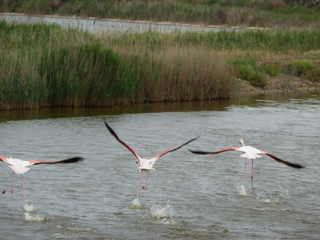 Später lasen wir, dass ab 17:30 - bis 8:30 keine Parkgebühr fällig ist. Ehrlich gesagt, so richtig prickelnd fanden wir den Stellplatz nicht. Überall Pferdeäpfel, auch am Strand und ein unangenehmer Geruch vom Kanal her und viele Mücken. Länger als eine Nacht wollten wir ja sowieso nicht bleiben. Da es zum Baden zu kalt war (Wassertemperatur und kalter Mistral) machten wir noch eine kleine Wanderung, beobachteten Flamingos und besuchten den, schon in der Vorsaison quirligen Ort. In den vielen Gaststätten und Snackbars, angereiht wie an einer Perlenkette, ist sicher für jeden Geschmack etwas dabei. An der Stierkampfarena mussten wir feststellen das wir den unblutigen Stierkampf leider um 3 Std. verpasst hatten. Schade!