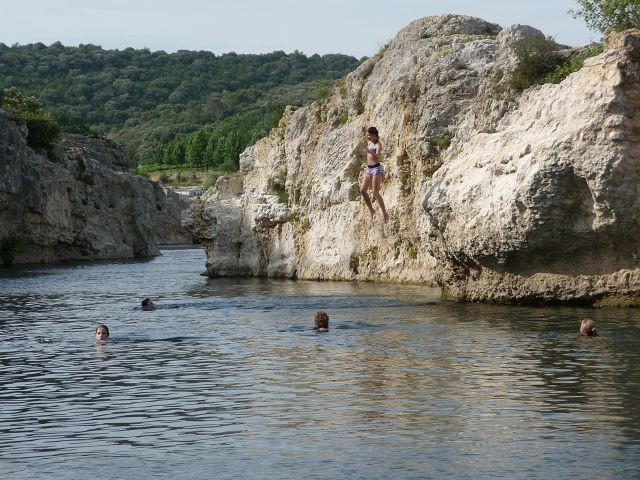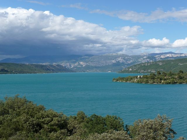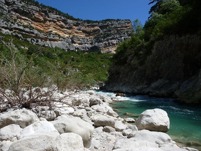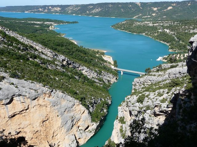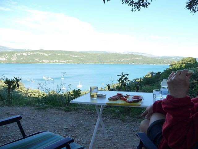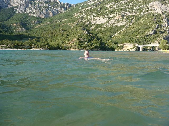 Nach dieser Anstrengung hatten wir uns ein kühles Bad verdient. Einen Badeplatz im Lac de Ste. Croix hatten wir uns schon auf der Hinfahrt ausgesucht. Direkt am Einlauf des Verdon an der hohen Galetas Brücke. Da hier das übernachten verboten war fuhren wir noch nach Riez.