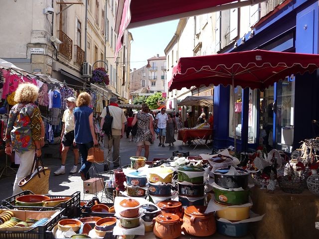 Es ist Freitag und es findet einer der größten Märkte in der Provence statt. Die aufgebauten Stände ziehen sich durch mehrere Straßenzüge. Hier findet man ALLES. Ob Klamotten, Kitsch, Bio-Produkte, Backwaren, Olivenöl, Wein ...... Den besten Parkplatz Porte d'Orange fanden wir erst, nachdem und das Navi in eine enge Sackgasse geschickt hatte und ein Wenden nicht möglich war. Also 200m rückwärts. Zum Glück kam niemand.