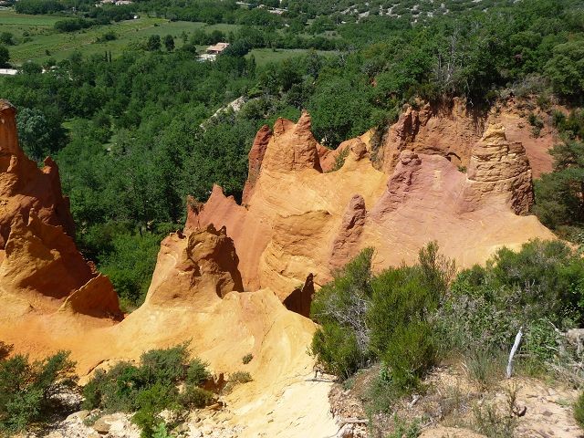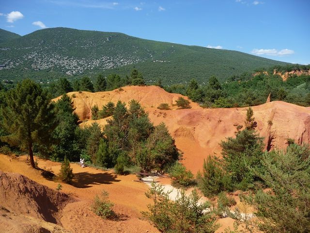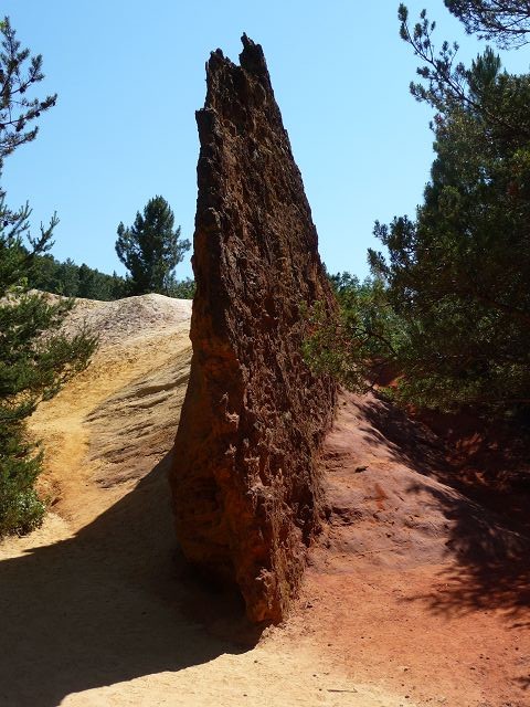 Nun führt unsere Tour weiter nach Rustrel zum Colordo Provencal. Wir zahlen 6 EUR für den Standplatz (mit Übernachtung 10 EUR) Eintritt ist hier inbegriffen. Aus dem uns ausgehändigten Prospekt wählen wir die schwarze Besichtigungsroute (2 Std.). Der Weg führt nur durch Wald und von den Ockerfelsen sieht man nichts. An den eingezeichneten Aussichtspunkten, hier hat man einen herrlichen Blick auf die Ockerfelsen, kehrten wir auf Empfehlung anderer Wanderer um und nahmen nun die blaue Route. Nach wenigen Minuten stehen wir dann mitten in der Sahara. Das Farbspiel ist schon beeindruckend. Wir laufen die gesamte Sahara ab und sind nach 1,5 Stunden wieder am WOMO.
