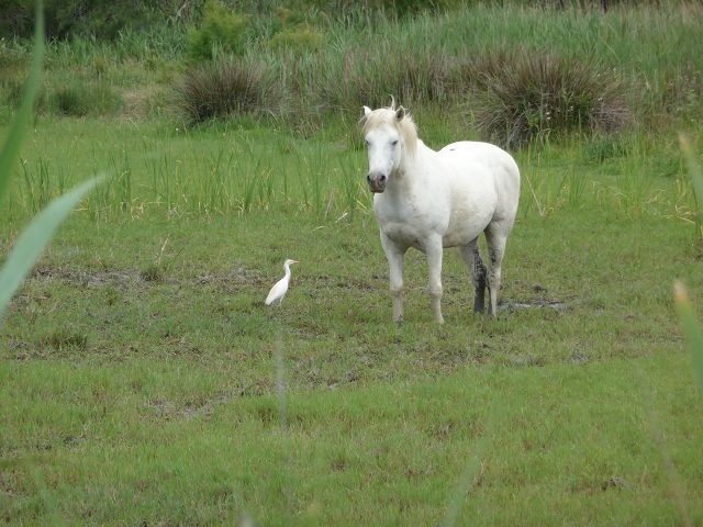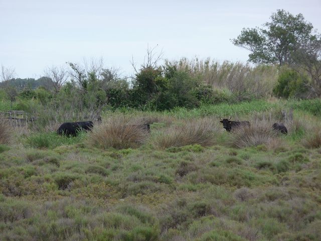Gegen Mittag zog es sich etwas zu und wir setzten unsere Fahrt fort. Unsere Camargue-Tour führt uns um den Etag de Vaccares herum zum angestrebten Ziel Strand von Beauduc. GPS: N:43°24'18'' , O: 04°35'38''. Entweder hatten wir eine falsche Zufahrt gewählt oder die Zufahrt ist nicht mehr erlaubt. Wir standen jedenfalls vor einem Schild - Durchfahrt verboten. Aber der Weg bis hier war ein Erlebnis. Wir sahen einige ungesattelte Camargue-Pferde in freier Natur, Herden schwarzer Stiere und viele Flamingos.