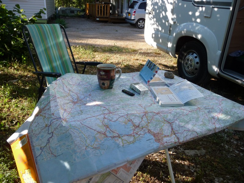 Wir wollten heute noch ein Stück fahren, damit unser nächstes Ziel Saint Croix du Verdun am nächsten Tag gut zu erreichen ist. WOMO-Führer zur Hand und einen Stellplatz auf dem Weg gesucht. Wir entschieden uns für den Campingplatz in St.Maximin. Wir mussten sowieso entsorgen, wollten wieder richtig ausgiebig duschen und die Akkus brauchten Strom. In der Vorsaison ist hier nicht viel los und der Platz machte auch einen etwas verwahrlosten Eindruck. Die Sanitäranlagen waren zur Hälfte gesperrt, das Restaurant geschlossen und das Schwimmbad ohne Wasser. Ich glaube auch das wir das einzige WOMO hier waren. Preis 17,80 EUR ohne Strom. Strom 4.80 EUR extra. Am Abend hatte es dann ein wenig gewittert. Ein Foto vom Platz haben wir vergessen, aber als Frühaufsteher sieht so meine Routenplanung für den Tag aus.