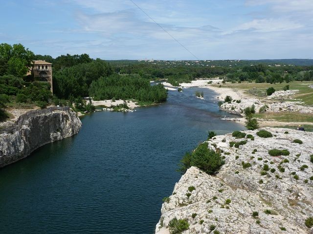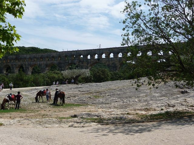 Scheinbar hatte ich falsch recherchiert. Also zurück nach Remoulins und gleich den ersten freien Parkplatz hinter der Brücke genommen. Die zwei Km bis zur Pont de Gard entlang der Platanenallee waren ja noch machbar. An der Brücke war reges Treiben. Es wurden Buden aufgebaut, mehrere open-Air Discos und ein Feuerwerk wurde durch Fassadenkletterer installiert. Am Samstagabend sollte hier ein großes Fest stattfinden. Wir überlegten ob wir bleiben sollten um das Spektakel zu erleben entschlossen uns dann doch zur Weiterfahrt.