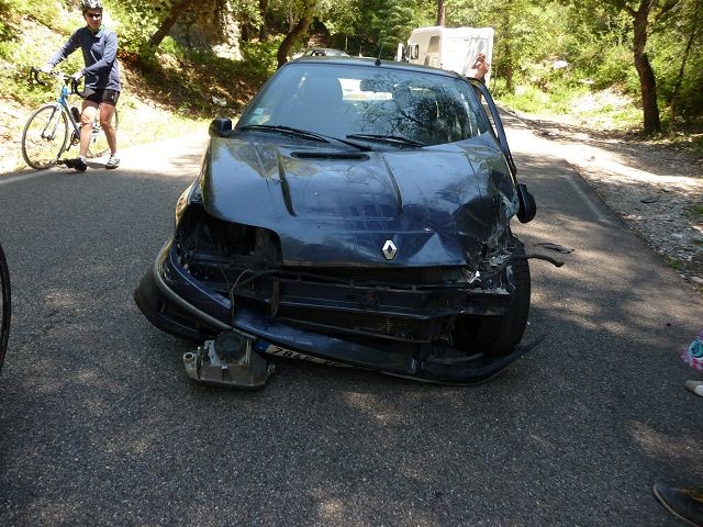 Aber dann geschah es. Ich glaube es war die erste oder zweite Kurve. So ein Volltrottel kam den Berg in einem Affenzahn runter, schaffte natürlich die Kurve nicht, verpasste uns eine volle Breitseite und kam ca. 50m hinter uns zum Stehen.Zum Glück blieben beide Parteien unverletzt. Was nun? Unsere französischen Sprachkenntnisse = Null. Seine Englischkenntnisse = Null. Also Polizei anrufen! Aber wie? Welche Tel.Nr?. Nach etlichen Versuchen stellte sich heraus, dass die Polizei nur kommt wenn ein Personenschaden vorliegt. Jetzt erst einmal viele Beweisfotos schießen und den Unfallbericht ausfüllen. Nun stellte sich heraus das der Typ keine Papiere bei sich hatte. Und jetzt? Erneut Polizei anrufen? Wie Ihr das erklären? Da sich nun schon ein kleiner Stau gebildet hat, hatten wir Glück im Unglück. Eine sehr nette Familie aus dem Elsass - sprach sehr gut deutsch - übernahm nun den Part des Dolmetschers. Führte nochmals Rücksprache mit der Polizei und füllte den Unfallbericht aus. Vielen, vielen lieben Dank dafür.
