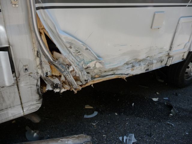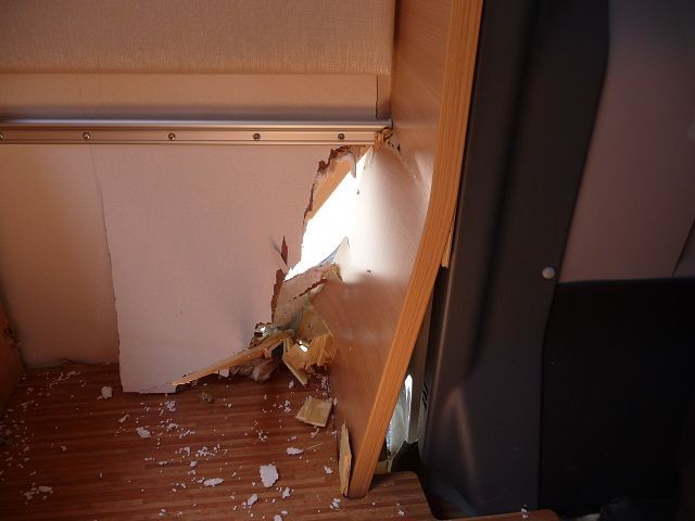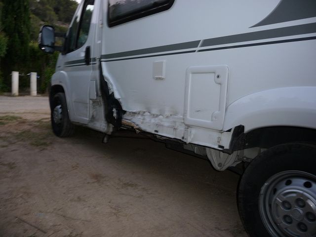Nach leichter Säuberung des Unfallortes und kurzen Check auf die Verkehrssicherheit und Fahrtauglichkeit des WOMOs (schien noch OK zu sein) suchten wir die nächste Gendarmerie in Beaumes de Venise auf. Also alles noch einmal mit Händen und Füßen und etwas Englisch erklärt. Wir dachten wir bekommen für die Versicherung ein Stück Papier von der Gendarmerie. Aber Fehlanzeige. Sie rief aber für uns eine Werkstatt an, welche das Fahrzeug richtig checken sollte. Doch das war ein Lacher. Der kam startete den Motor schaute sich das Loch im Aufbau an, sagte das eine Reparatur in Deutschland teuer wird und fragte uns wo sei das Problem und verschwand wieder. Das war uns dann doch zu heikel und wir nahmen erneut Kontakt zum WOMO-Vermieter. Seine Schutzbriefversicherung sicherte uns dann zur Begutachtung eine Fachwerkstatt zu. Und wer kam, der gleiche Typ wie vor einer Stunde. Da es nun schon 18:00 Uhr war,hielt sich seine Reparaturlust in Grenzen. Etwas Klebeband über das Loch, nochmals Motor gestartet und schon war er wieder verschwunden.