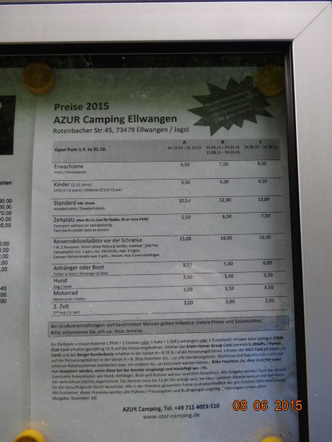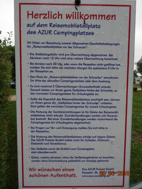 Die Schranke im Hintergrund gehört zur Einfahrt in den CP ![]() Wir haben heute für den Stellplatz pauschal 16€ bezahlt, also inkl. Strom. Waren Anfang Juni auf dem Campingplatz - Stellplatz kostet gleich viel wie Nebensaison mit Acsi :ja: --> Link Netter Platz aber vorwiegend Gespanne anzutreffen :) , man steht auf Rasen im Camping und auf dem Stellplatz. Freundlicher Empfang, Brötchenservice am Platz, Chefin und Mitarbeiter bemüht. Sanitär sauber und zweckmässig, auf dem WC sogar Papier vorhanden. V/E vorhanden, Müllcontainer vorhanden, Waschmaschine und Trockner vorhanden, separater Raum für Chemie WC vorhanden. Toller Ausgangspunkt um Ellwangen und die Umgebung zu erkunden, tolle Radwege vorhanden. Hier noch ein paar Bilder vom Platz Einfahrt zum Camping ![]() ![]() Blick auf's Restaurant ![]() Stellplatz ![]() wie weit das mit den Angaben auf der Info kontrolliert oder gehandhabt wird kann ich nicht beurteilen ![]() aus der Ferne - Campingplatz ![]() Sanitäreinrichtungen, nicht die modernsten aber sauber und zweckmässig :ja: Duschhaus mit aussen Geschirrspüle ![]() Waschmaschinenplatz und separat Chemieentsorgung ![]() ![]() ![]() Dusche mit separetem Abteil für Klamotten und sonstiges - also Platz genug ![]() WC Trakt ![]() ![]() Sammelstelle für Müll ![]() V/E Stelle, für Frischwasser sollte man seinen eigenen Schlauch dabeihaben, wer mit Giesskanne Wasser holt sollte unbedingt das kurze Stückchen Schlauch abnehmen da hier auch Chemie - WC gespült werden :( ![]() Gibt noch einen tollen Grillplatz auf dem Camping hab da jetzt aber leider kein Foto davon gemacht :? Haben am 01.07.2016 auf dem Stellplatz übernachtet. Preis:16€ Alle Einrichtungen des Campingplatzes dürfen genutzt werden – ausgenommen die Duschen. Entsorgungsstation ist gesperrt. |