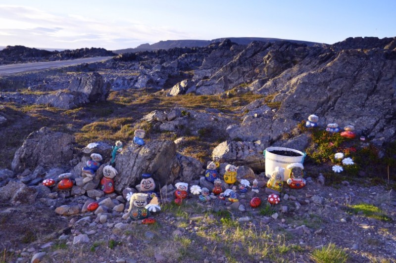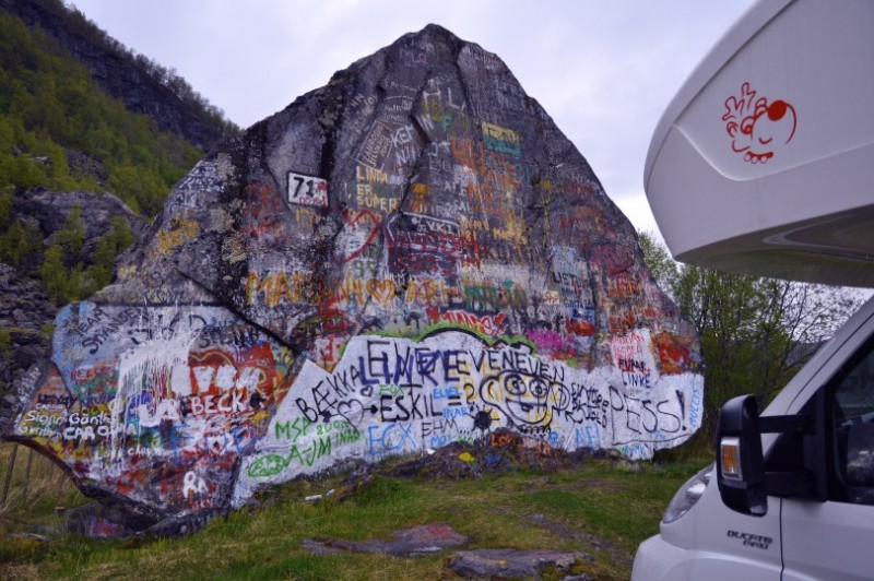 Zurueck auf der 6 kann man sich bei Nordkjosbotn auf dem Piggstein als Reisender verewigen. Da der erste Stein nicht mehr ausreicht, hat er mittlerweile einen kleinen Nachbarn gefunden.