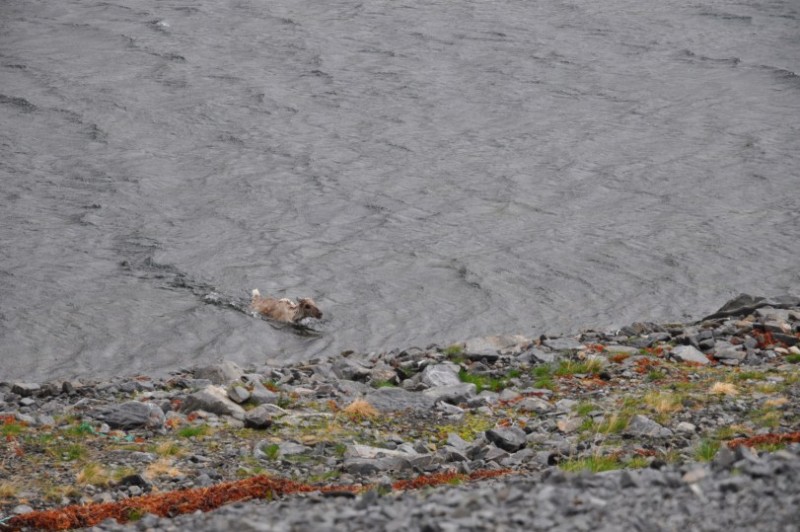 Rentiere koennen ins Wasser fallen, aber schwimmen unbeirrt weiter.