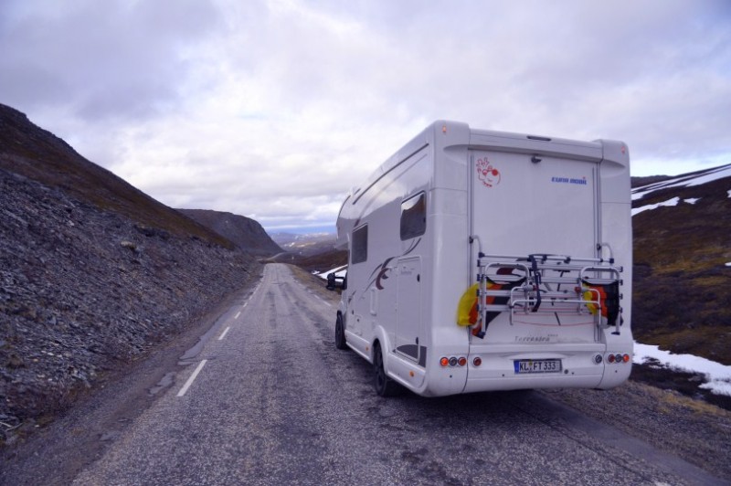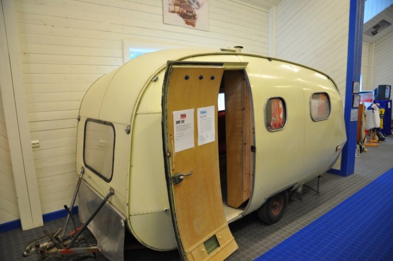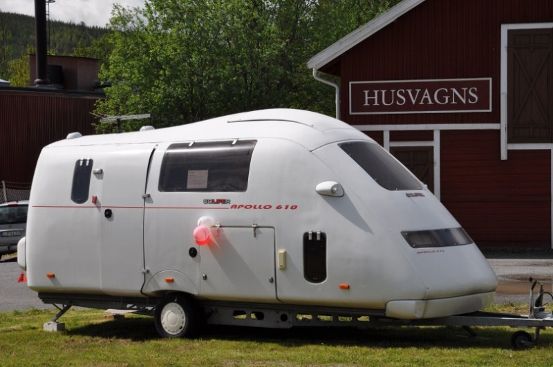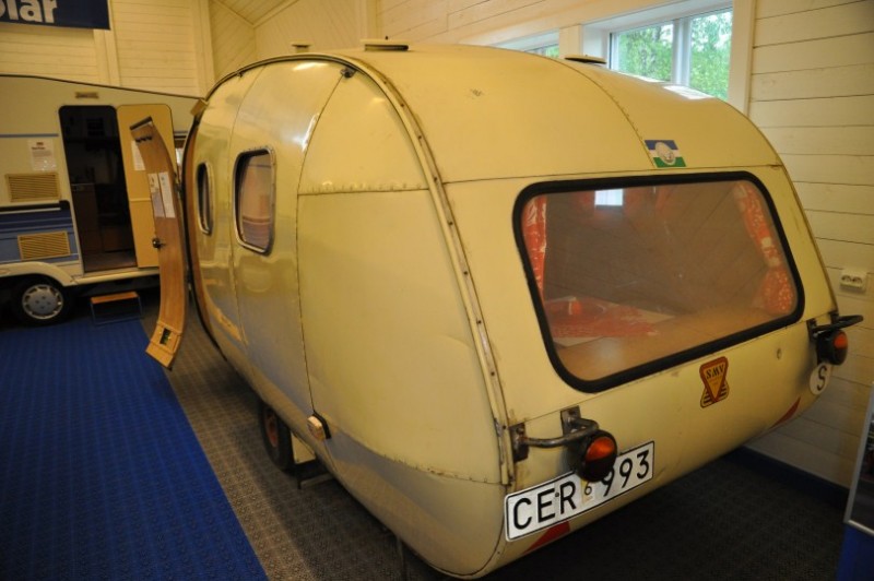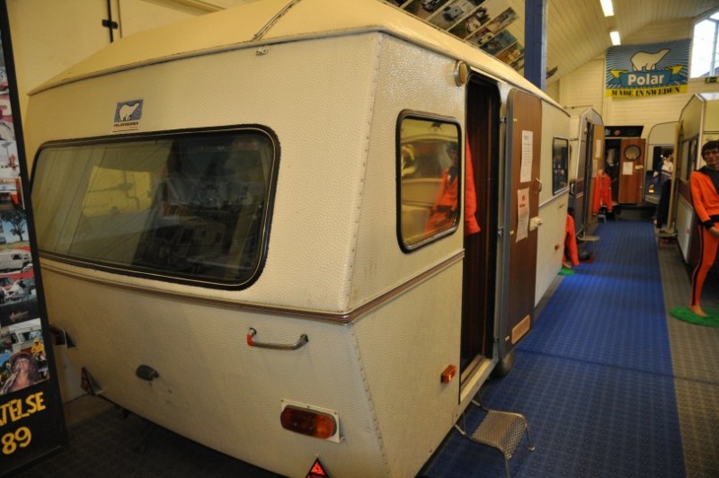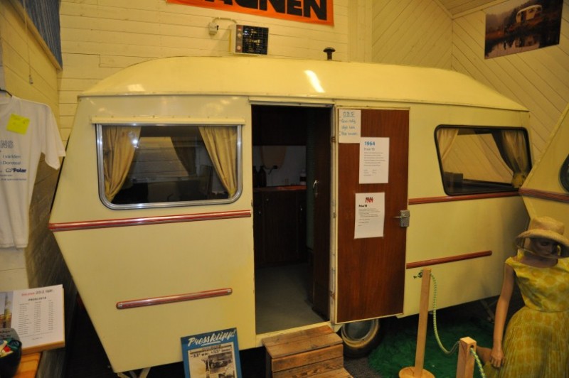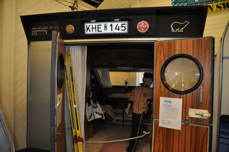 Dann aber packt uns wieder die Sehnsucht nach Norwegen und kurzfristig aendern wir unseren Plan und tauschen schwedische eintoenige Waldschneissen gegen bald folgende Norwegische Traumstrassen. Erstmal gehts weiter nach Dorotea ins Museum der Marke Polar, wo uns dieser Raumfahrtcaravan am Strassenrand neugierig macht. Sonst haetten wir das Museum gar nicht entdeckt. Innen war es eher "Normalkost". Geschlafen wird im Bug unterhalb des tiefen Fensters - recht seltsame Vorstellung.