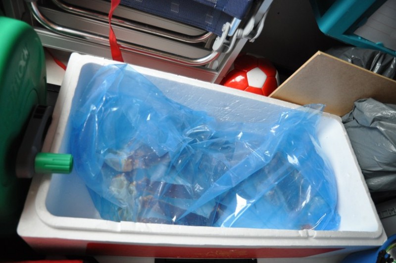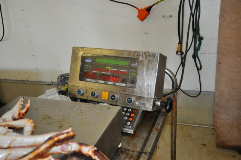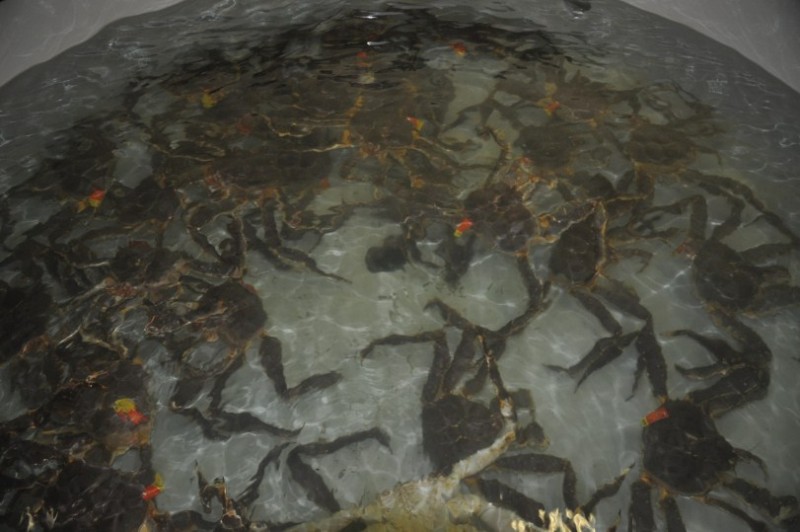 Das solls also gewesen sein mit dem Krabbenvergnuegen? Wahrscheinlich siehts fruehmorgens besser aus, aber jetzt aufgeben? Bevor wir weiterfahren schleiche ich in die Fabrikhalle, treffe dort auf einen Arbeiter und frage hoeflich, wo man denn hier diese tollen Viecher fuer den Kochtopf FRISCH kaufen kann. Er erzaehlt mir was von Versand nach China und Japan, Preise, dass es mir schwindlig wird und an seinem Akzent erkenne ich, dass er aus der Heimatecke meines Vaters oder meiner Oma kommen muss - also irgendwo zwischen dem ehemals jugoslawischen Mazedonien und dem griechischen Mazedonien. Richtig, er ist Albaner und schon sind wir am Plaudern. Er bietet mir einen Rundgang an, erklaert mir die unterschiedlichen Qualitaetsstufen und macht mir klar, dass er leider hier nichts verkaufen darf. Alles fuer den Transport bestimmt. Aber schenken darf er mir welche. Also wiegt er eine ab, die Waage zeigt knapp ueber 2 KG an und spaeter sehe ich, dass er sogar 2 eingepackt hat. Dafuer war das Trinkgeld fast schon zu bescheiden. Da wir die Monster in Etappen kochen mussten, waren wir damit insgesamt 2,5h beschaeftigt und Teile des ausgeloesten Fleisches kamen noch fuer den naechsten Tag kalt in den Kartoffelsalat. Das Scherenfleisch kam wie eine 100 gr Bratwurst einfach so aus jeder der 8 Scheren herausgefloppt - traumhaft und besser als jeder Hummer.