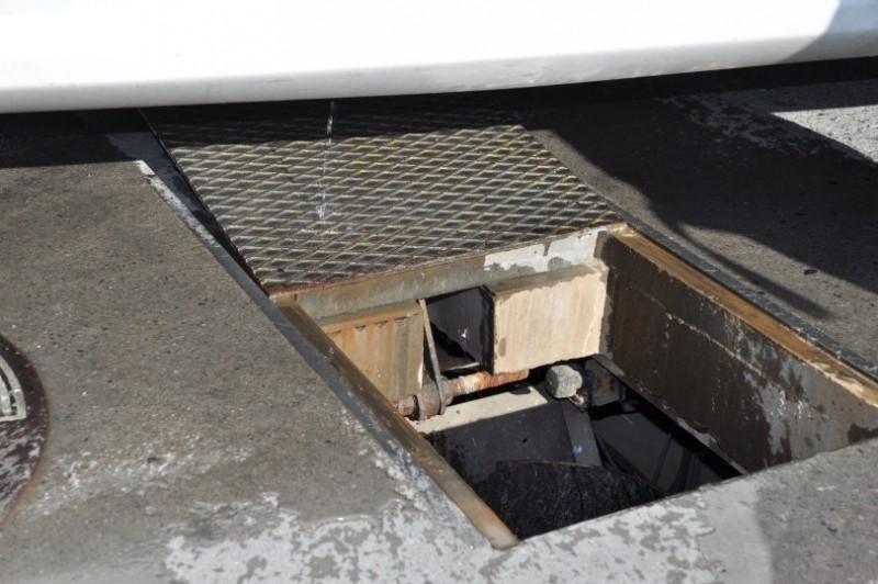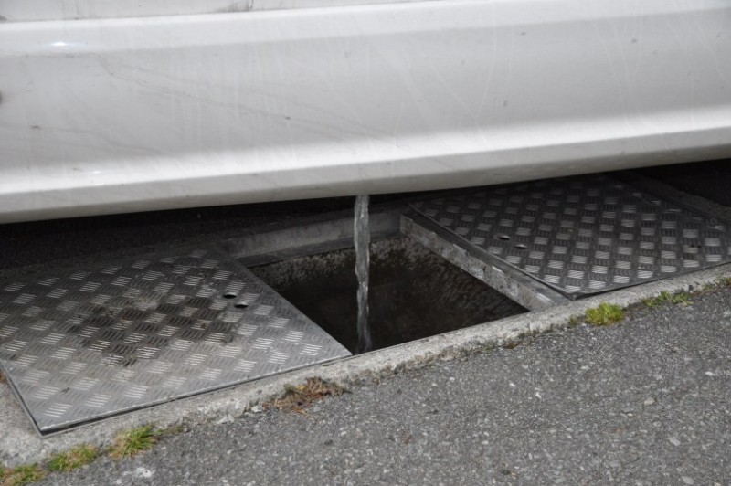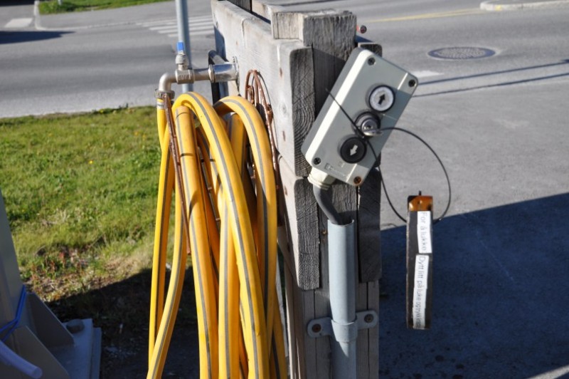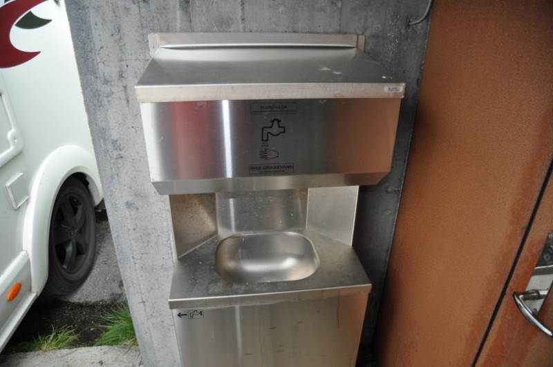 ueber einen Schleichweg an der Kueste entlang, der schoen ist und gleichzeitig ohne Umweg NOK 60 Maut spart: ueber Ranheim, Malvik, Hommelvik, Muruvik und Hell faehrt man parallel zur 6 und landet dann in Stjoerdal beim Radisson Airporthotel an dieser interessanten Ver-/Entsorgungsstation, fuer die man sich an der Kasse einen Schluessel besorgt, mit dem man den automatisch betriebenen Schacht aufsperrt.