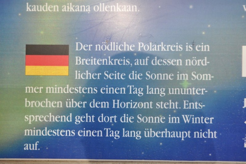 Auf den Sapmi Park verzichten wir und sehen uns nur den Tourishop an. Ich wollte mir den ganzen Urlaub ueber ein Finnenmesser kaufen, war aber durch die Preise abgeschreckt. Zum Glueck, denn am guenstigsten TIPP: sind diese direkt in Rovaniemi bei der Firma Marttiini zu haben. Bei schoenem Wetter kann ich den Park unbedingt empfehlen. Er schildert anschaulich das Leben der Samen frueher und heute und durch Laiendarsteller wird man auch in so manche Kunst und Fertigkeit wie z.B. Lassowerfen etc eingeweiht. Und auch das Samiit Vuorka-Davvirat Museum macht bei diesem Wetter keinen Sinn. Auch das kann ich jedem empfehlen, der sich dafuer interessiert, wie man frueher in Lappland zu wohnen pflegte.