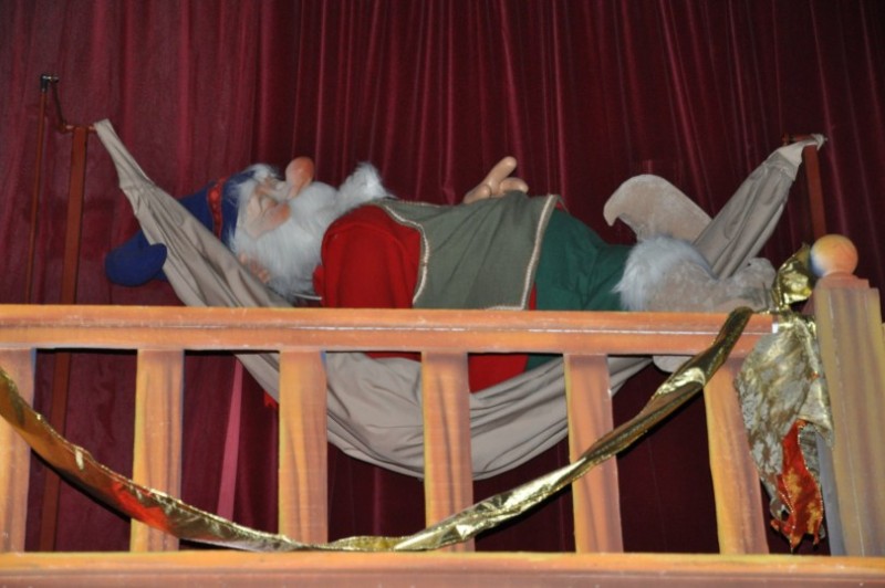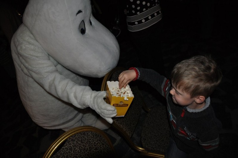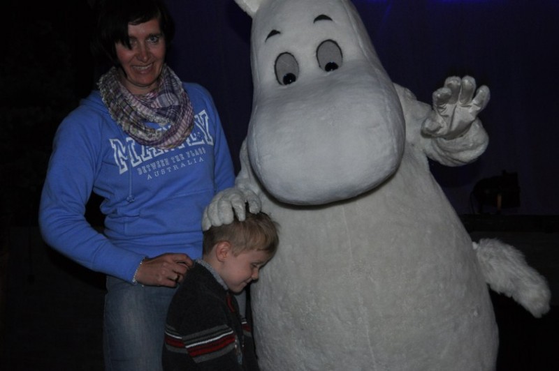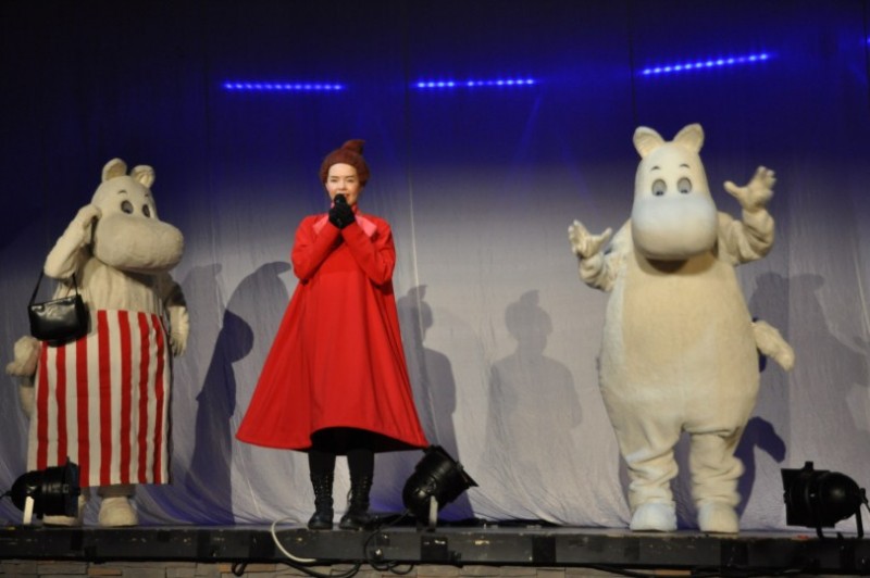 ...dazu treten die in Finnland bekannten Mumins auf. Die Mumins haben in Finnland absoluten Kultstatus bei Klein und Gross. Es gibt mehr Merchandisingartikel von den Mumins als von Micky Maus.