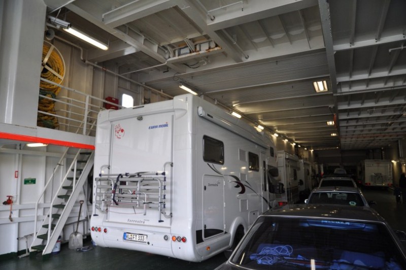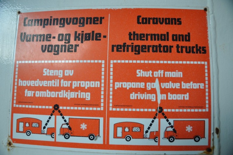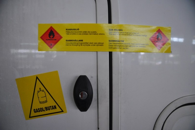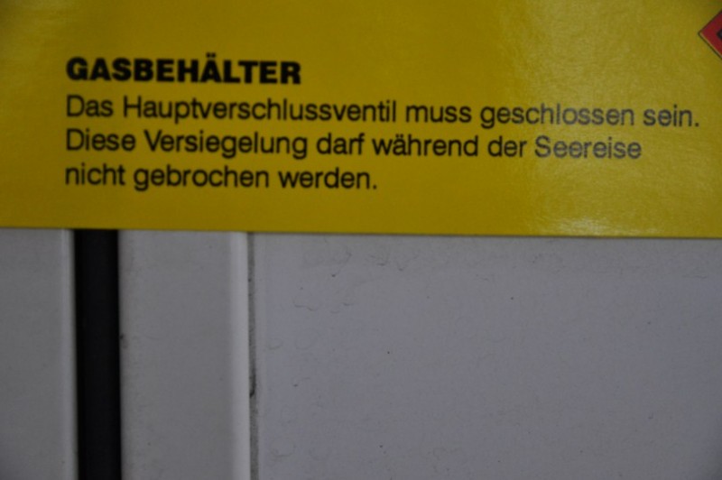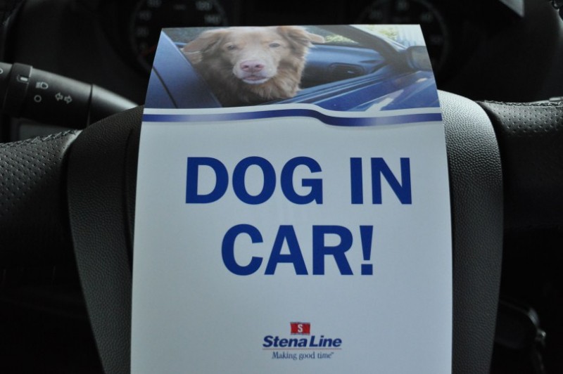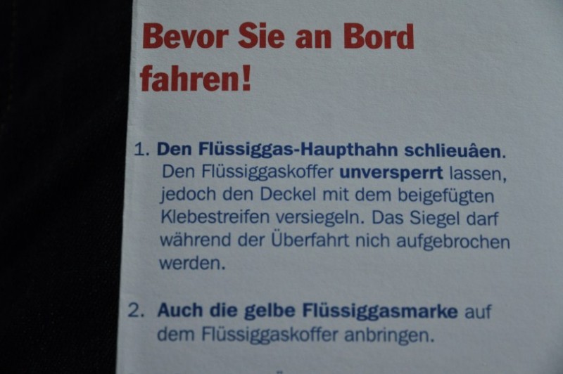 Ablauf Faehre Stena Line beim check-in: Fuer den Hund gibts eine Karte, die man ins Fahrzeug legt, fuer den Gastank gibt es 2 Aufkleber. Einer muss auf die Stauklappe, der andere muss als Siegel die Tuer und die Aufbauwand verkleben. Die Flasche muss zugedreht werden, der Kasten muss offen bleiben.