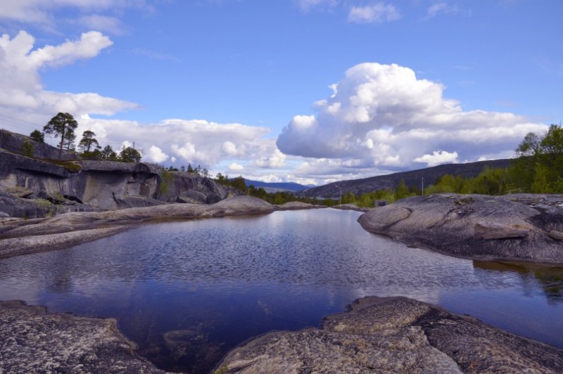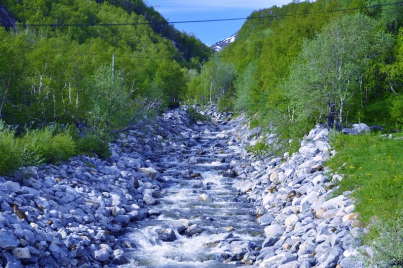Navi meint 45 m unter Absaufen??? ![]() Und weiter fuehrt uns die Route teils schoen sonnig, teils bedeckt wie beim Laksfossen (das Bild mit dem Wasserfall), teils einfach saukalt, aber dennoch sonnig und vor allem immer wieder abwechslungsreich auf der 6 und hinter Mosjoen auf die 78 zurueck auf die 17.