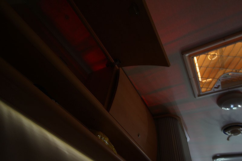 Als es morgens im Womo noch dunkel war, draussen aber schon die Sonne draufknallte, habe ich innen an den Wänden einen "rotbraunen" Schimmer gesehen, als ob Wände und Decken nicht vollkommen lichtundurchlässig wären.
