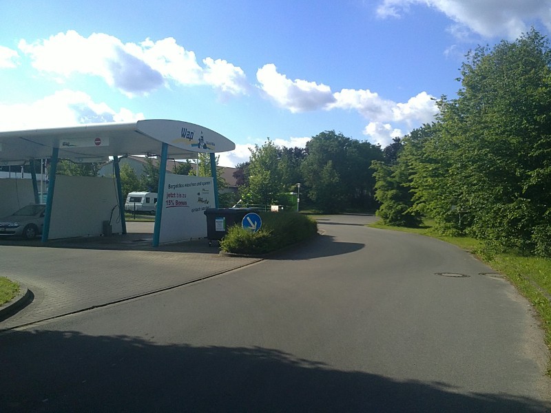 Zwei Wohnmobilplätze sind auf diesem Pkw-Parkplatz eingerichtet. Sie sind am Rand des Platzes und etwas ungünstig geneigt. In der Mitte des Platzes sind 2*4 Pkw-Plätze. Dort können, wenn nichts los ist, auch große Wohnmobile stehen. Der Platz befindet sich hinter einer Pkw-Selbstwaschanlage. Hier der Blick über die Zufahrt: