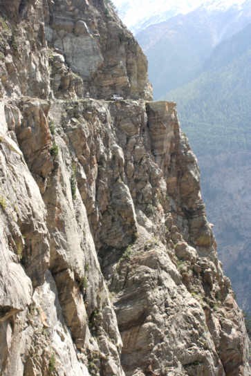 Absolut spektakulär! Mehrere Hundert Meter senkrecht nach unten - aber direkt neben der Straße, häufig ohne Leitplanke oder Stopsteine (nach oben ging es auch mehrere Hundert Meter- konnte man aber immer nur aus der Ferne sehen, da die Felsen meist überhingen). Manchmal fehlte auch talseits ein Stück der Strasse - war halt abgestürzt! Wenn ein LKW entgegenkam musste man zu einer Stelle zurück, an der gerade beide Fahrzeuge aneinander vorbei kamen. Ein Fahrzeug stand gerade noch so auf der Fahrbahn. Ich war immer froh, wenn wir bergseits fuhren oder standen.... Ich bin daran erinnert worden, weil heute im N-TV ein Bericht über "Tödliche Strassen" lief - und das waren genau die Strassen, die wir auch gefahren sind - aber mit einem Jeep. Wen es interessiert: Es war grob die Richtung Shimla-Rotang Pass. Diese Strassen gibt es dort aber in viele Richtungen...