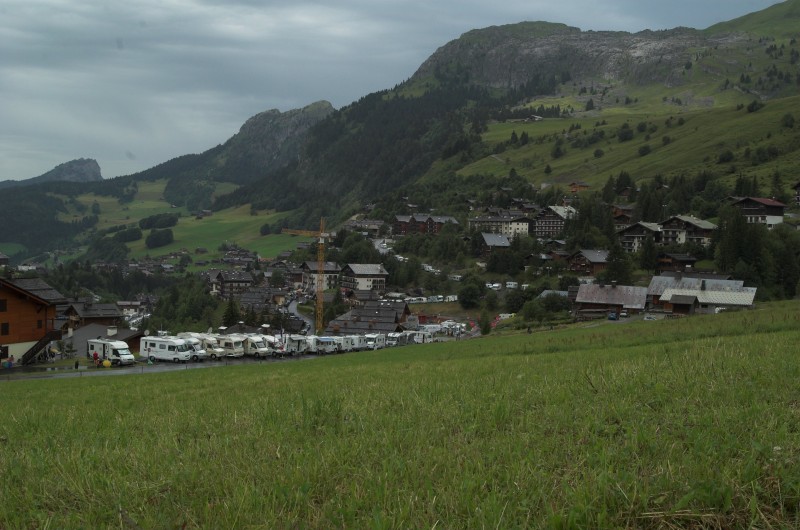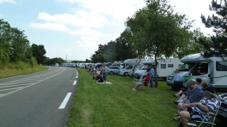 Alpenetappe: Anreise mehr als eine Woche vorher notwendig, Ein Parken z.B. in Passhöhe war nicht möglich, alles voll, einem deutschen Phoenix-Fahrer konnte ich entlocken, dass er seit8 Tagen sich den Platz gesichert hatte. Am Dorfrand sperrte die Polizei für alle Womos die Weiterfahrt. Am Tag der Etappe stand auf jedem freien Platz im Dorf, gleich ob Garagenzufahrt, Einfahrt,oder Parkplatz mehr als ein Auto.