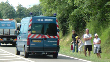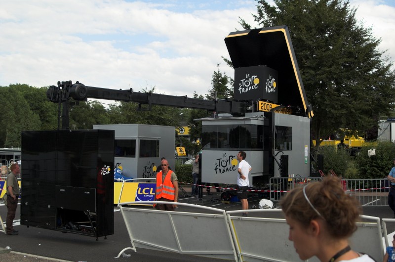 Im Zielortist die Ortsdurchfahrt idR ab ca. 22.00 Uhr gesperrt, damit die anrollenden Fahrzeuge für Seitenabsperrung, Komentatorenkabinen Zielbühne usw. aufgebaut werden kann. Der Zielstrich wurde in St.Fargeux z.B. am Morgen auf die Strasse gepinselt. Für Techniker ist der gesamte Bereich mehr als interessant. Die Sprecherkabinen sind dreietagig, obwohl nur ein Sattelauflieger vorfährt, die Zieleinrichtung mit Kameras, Zielrichterplatz usw. ist eigentlich nur ein Tandemhänger, obwohl das ganze Gerödel auch über eine 12 m breit Strasse passen könnte.