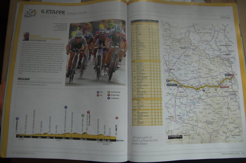 Kostet € 6,95, dafür erfährt man einmal, mit welchen Durchsschnittsgeschwindigkeiten die Jungs jeweils unterwegs sein müssen, damit das Finale auch schön um 17.30 erledigt ist. Für heute gilt z.B. bei langsamstem Schnitt von 42 km/h, dass sie um 17.26 im Ziel in Metz sind.