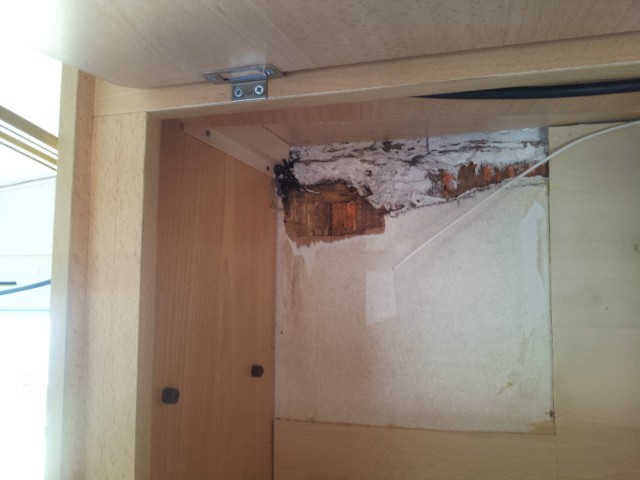 - später dann feuchte Stelle vorne rechts an der Ecke festgestellt. Das Wasser hatte sich im Doppelboden unter dem Linoleum gesammelt und für Fäulnis gesorgt
