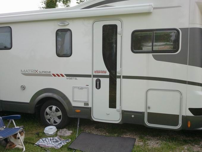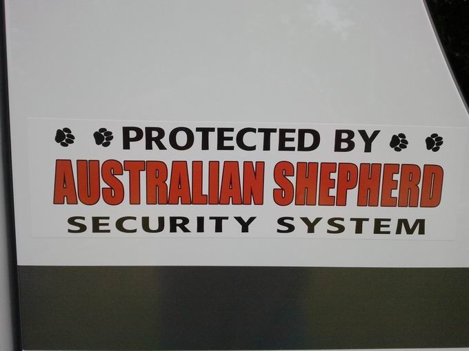 Das beste Sicherheitssystem ist daher immer noch der Hund an Bord :) Wir haben uns für ein ein Australian-Shepherd-Sicherheitssystem entschieden! :D Unser Aussie ist so dermaßen wachsam, da gibts aber einen Höllenalarm, wenn jamand fremdes ans Wohnmobil geht. Ob der Aussie-Bub auch zubeißt? Glaube ich eher nicht, aber bei dem Theater sind bestimmt nicht nur wir hellwach ;) Aus lauter Vorsicht - und um den Einbrechern gegenüber fair zu bleiben - haben wir das auch deutlich von außen sichtbar angeschlagen, natürlich international in Englischer Sprache :D Hier versteckt sich der Schlingel hinterm Klappstuhl, um von möglichen Einbrechern nicht gleich erkannt zu werden................. Wir haben aber die Warnung deutlich sichtbar an der Tür angebracht, passend zum Dekor in den Farben scharz/weiß/rot und grau