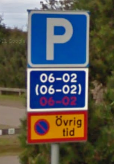 In Staedten wird das Schild aufgestellt um explizit an festen Tagen dafuer zu sorgen, dass dort niemand parkt, weil am naechsten Morgen die Strassenreinigung oder Muellabfuhr durchfahren muss und hierfuer die Strasse freigehalten wird. Das Schild steht an einem Strandparkplatz in Varberg. 8)