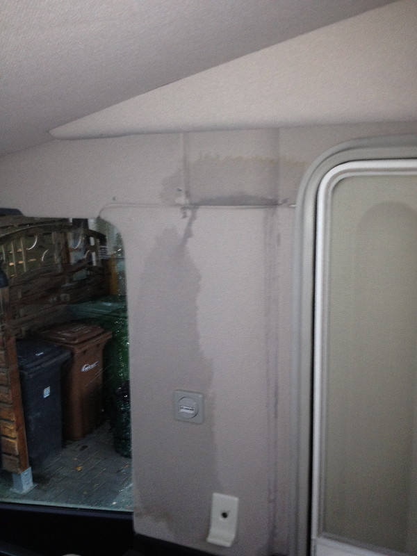 Foto Wasserschaden...sieht sehr danach aus als ob die obere Dichtung auf dem Dach undicht ist..das ist ja Patschnass...gerade an der verbindung zum vorderen Teil des Aufbaus (der zum Glück komplett aus Gfk ist)befindet sich die erste Holzlatte...die geht komplett bis zum Boden.