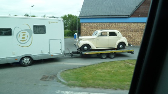 Vor 2 Wochen in Frankreich habe ich dieses Gespann im Vorbeifahren gesehen. Leider kenne ich die Automarke auf dem Hänger nicht. Sieht aber ganz gut aus.
