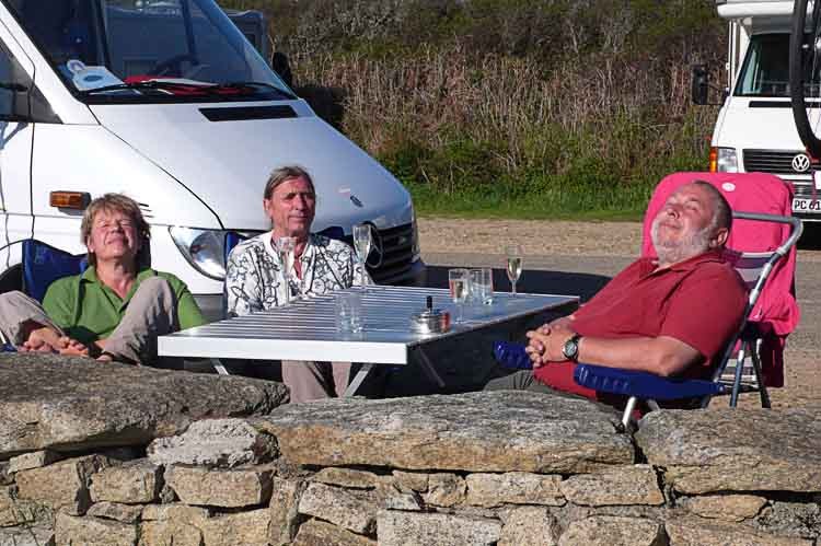 Wir wollen gerade an den Strand hinunter gehen, kommen Brigitte und Franky. Wir stehen diese Nacht auf einer Wiese, die eine etwas weiche Zufahrt hat und hoffen dass wir Morgen wieder hinauskommen. Wir köpfen die erste Flasche Champus und stoßen auf unseren gemeinsamen Urlaub an. Franky bekocht uns heute mit Rindersteaks. Nach dem Essen beginnt es zu regnen, das schlechte Gewissen treibt uns doch noch zu einem geschotterten Parkplatz. Fortsetzung folgt. aus Oberösterreich Alfred