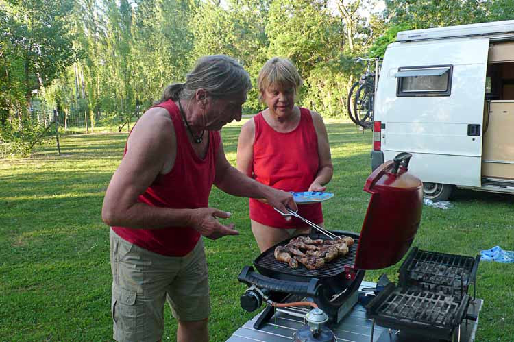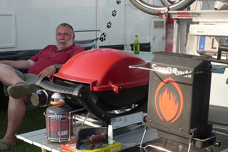 Am Abend wird gegrillt, Hühnerkeulen und Gemüsepackerl mit Erdäpfeln. Es ist sehr warm, wir können ohne Jacken bis 23:00 Uhr draußen sitzen.