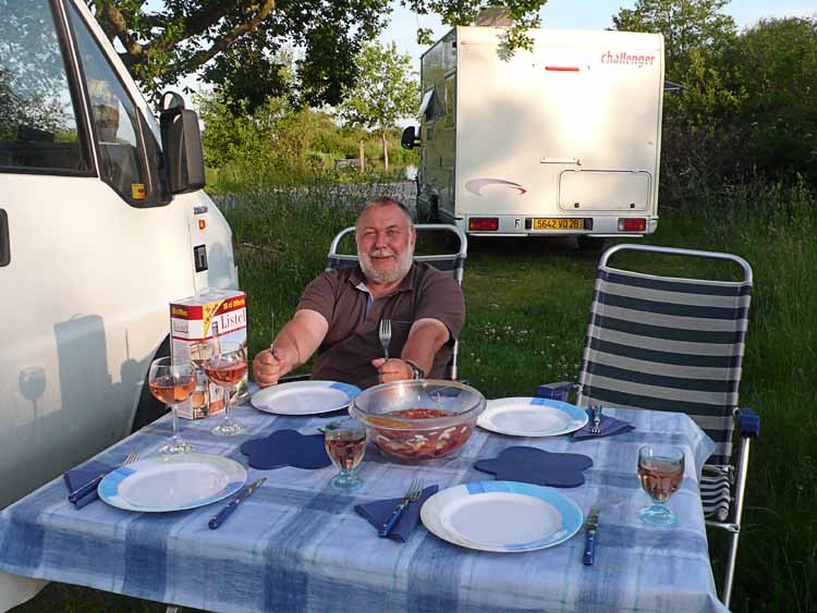 Wir fahren noch bis Vannes auf einen Campingplatz und lassen den Tag ausklingen. Abend gibt es Hummersuppe und Fischfilet.