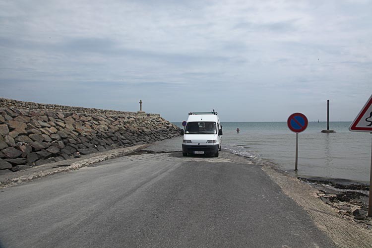 Die Passage de Gois kann man bei Ebbe mit dem Auto durchqueren, laut Anzeige wäre dies erst um 19 Uhr möglich. Wir machen noch ein paar Fotos, unter anderem fahren auch wir aus dem Meer.